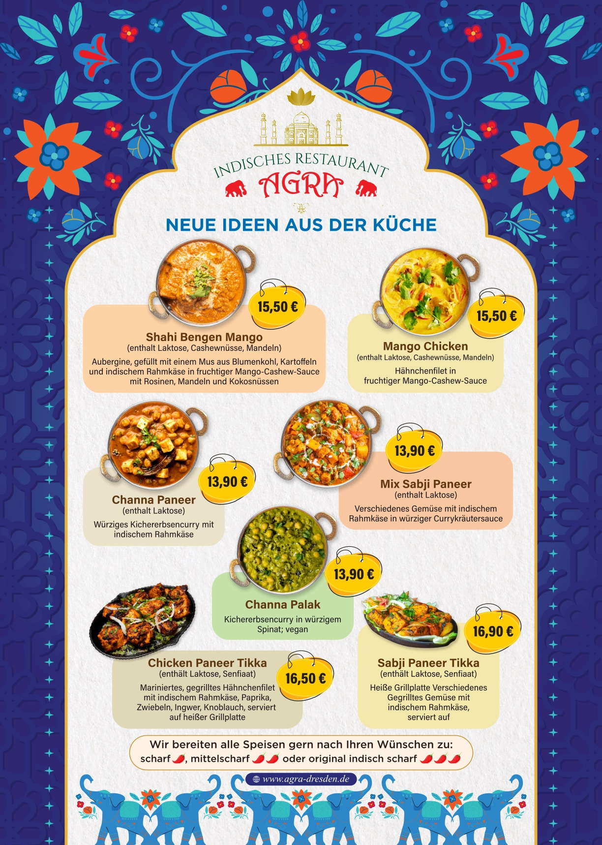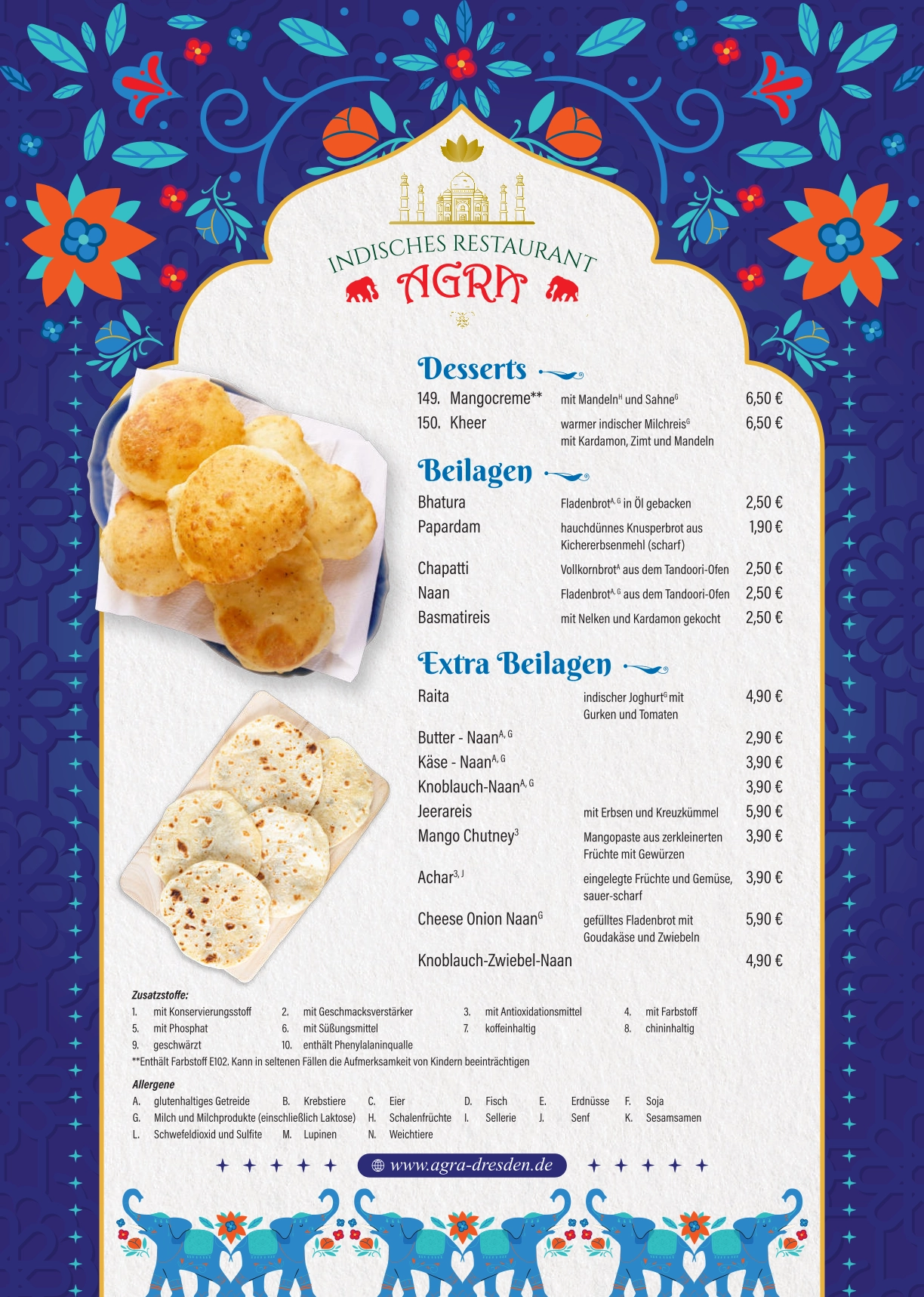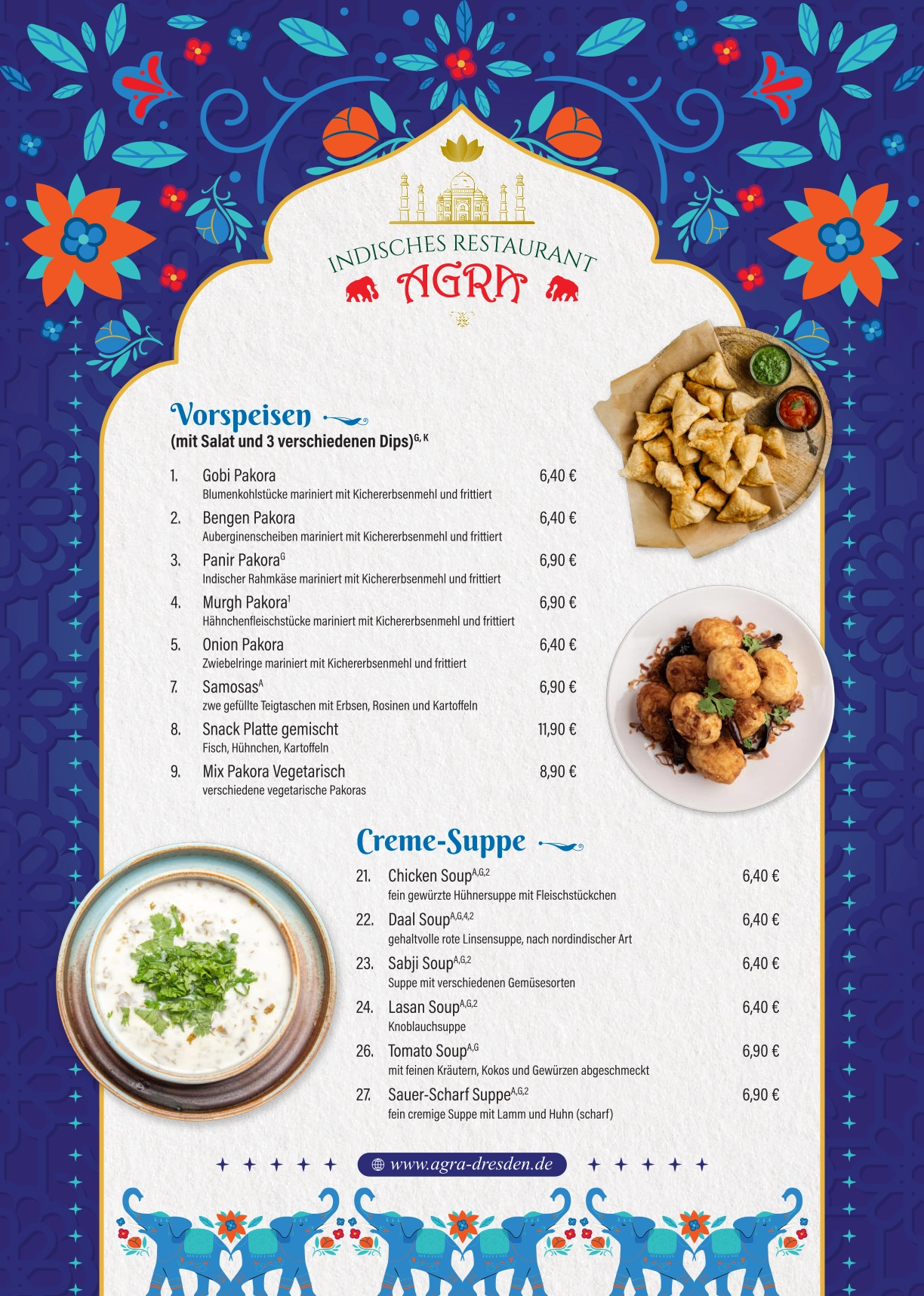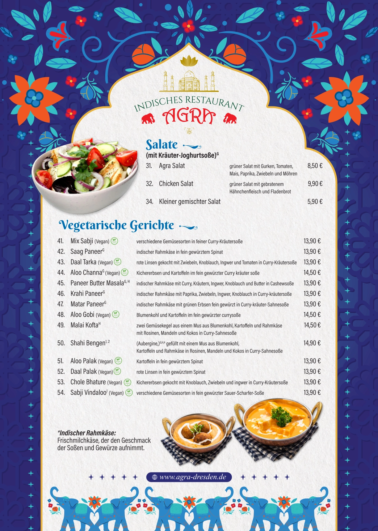 UNSERE SPEISEKARTE Navigieren Sie sich durch unsere Speisekarte oder laden Sie diese runter. Speisekarte als PDF downloaden Schnellkontakt: ÖFFNUNGSZEITEN: TÄGLICH 11:00 bis 14:30 Uhr und 17:00 bis 23:00 Uhr ADRESSE: Eilenburger Str. 16 01309 Dresden 0351-8365222 info@agra-dresden.de Finden Sie uns auf: